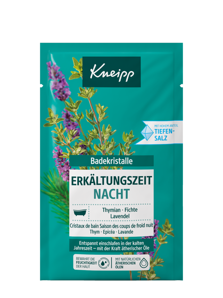 Die Kneipp® Badekristalle Erkältungszeit Nacht wirken pflegend und wohltuend, besonders an Abenden in der kalten Jahreszeit. Der Duft mit der Kraft ätherischer Öle aus Thymian, Fichte und Lavendel wirkt in Verbindung mit dem beruhigenden Blau des Badewassers und der wohltuenden Wirkung warmen Wassers entspannend und bereitet in der Erkältungszeit auf das Einschlafen vor. Der Körper wird angenehm durchwärmt und das Wohlbefinden verbessert, während das Bad mit natürlich pflegendem Öl die Feuchtigkeit der Haut bewahrt.