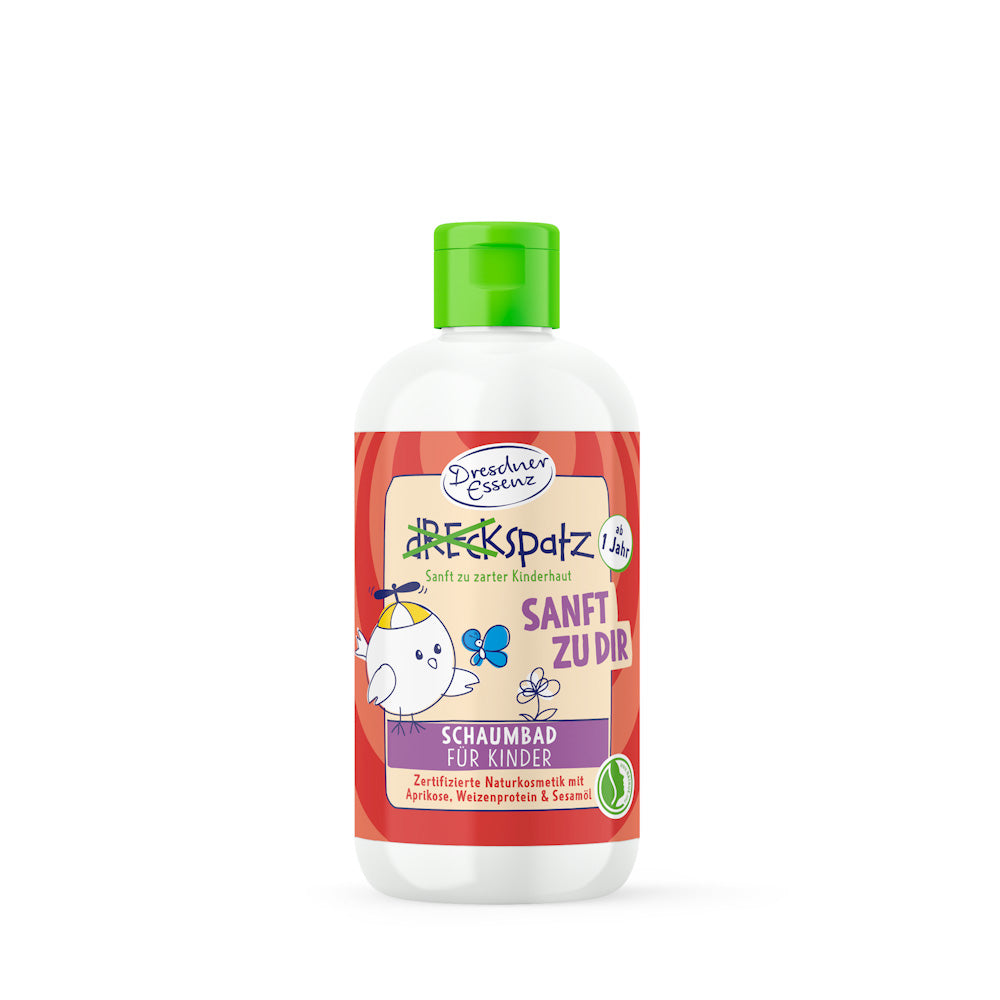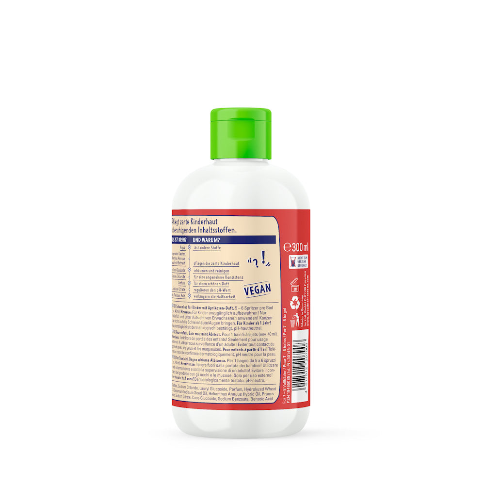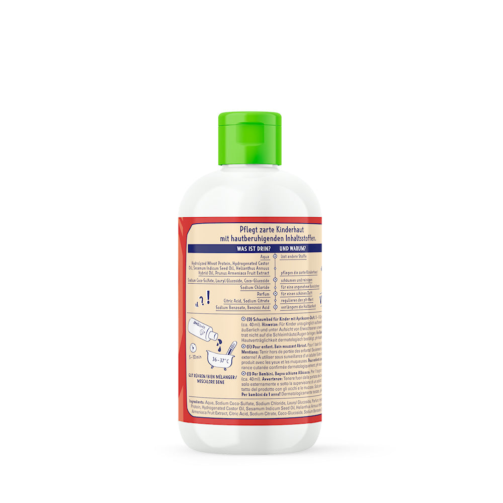 Erlebe ein fröhliches Badevergnügen mit dem Schaumbad für Kinder SANFT ZU DIR, welches die zarte Kinderhaut mit hautberuhigenden Inhaltsstoffen pflegt. Angereichert mit Bio-Sesamöl und Weizenprotein hilft es, die Haut vor dem Austrocknen zu bewahren und sorgt für eine wohltuende Pflege. Der zarte Duft nach Aprikose umhüllt dein Kind und verwandelt das Bad in ein duftendes Abenteuer voller Schaumberge. Milde Zuckertenside reinigen die Haut besonders schonend und lassen das Bad zu einem angenehmen Erlebnis werden. Perfekt für jeden Tag und ein lächelndes Kindergesicht!